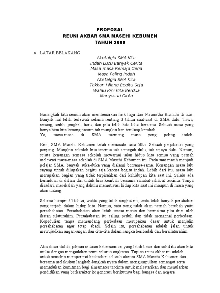 Demikian proposal reuni 30 tahun alumni 86 sma negeri 1 pematangsiantar ini dengan harapan semoga tuhan yang maha esa m erestui seluruh upaya yang kita lakukan dalam m ensukseskan nya. Proposal ini bertujuan untuk reuni akbar sekolah tinggi theologia jaffray. Kenangan dikala remaja semasa sekolah yang penuh dinamika terukir dengan manisnya disebuah gedung sekolah di timur purbalingga. Latar belakang kerinduan, mungkin adalah kata yang tepat dan penuh makna, kerinduan yang mendasari keinginan untuk saling berjumpa. Termasuk didalamnya adalah masa yang penuh dengan gejolak. Judul proposal alumni smp negeri 5 lhokseumawe kembali berkumpul, menjalin persaudaraan dan menciptakan rasa kepedulian 2. Jangan lupa untuk meminta kontak telefon dan media sosialnya, atau jika ada sebuah group di media sosial ikutlah bergabung didalamnya. Proposal reuni akbar alumni smp negeri 5 lhokseumawe. Panitia reuni smp n painan angkatan 1990 alumni smp negeri painan angkatan 1990 2. Harapan kami semoga yang telah kami programkan serta rencanakan ini, dapat terlaksana dan berjalan dengan lancar. Smpn 1 pracimantoro merupakan sekolah menengah pertama yang telah berdiri sejak lama dan menghasilkan lulusan berkompeten dan berguna bagi agama, bangsa dan negara. Foto reuni ukuran besar jika ditempel diruang guru, aula atau balai penyuluhan bisa memotivasi siswa saat itu agar bisa sesukses alumninya. Secepatnya format akan diganti pdf.file proposal pengajuan bantuan penggalangan dana sponsor reuni akbar sma n 10 purworejo disusun oleh: